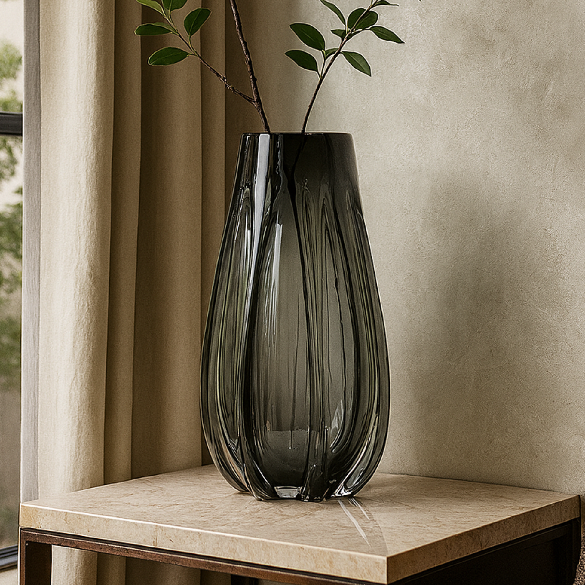 Soft Smoke, Strong Form - Spherical yet sleek, this smoke-colored glass Glass Vase pairs beautifully with pampas grass or sculptural branches. A striking piece on its own or clustered with others.