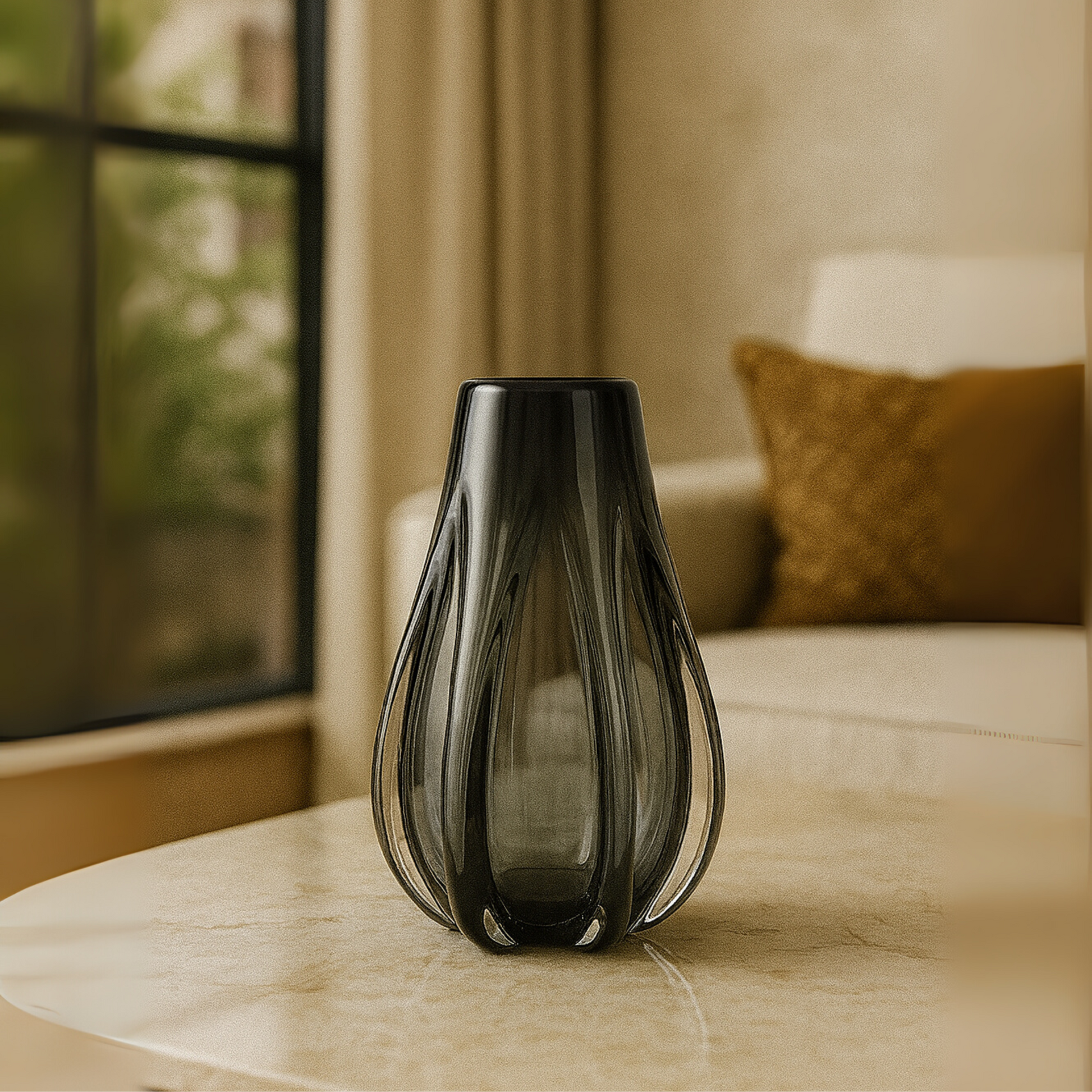 Soft Smoke, Strong Form - Spherical yet sleek, this smoke-colored glass Glass Vase pairs beautifully with pampas grass or sculptural branches. A striking piece on its own or clustered with others.
