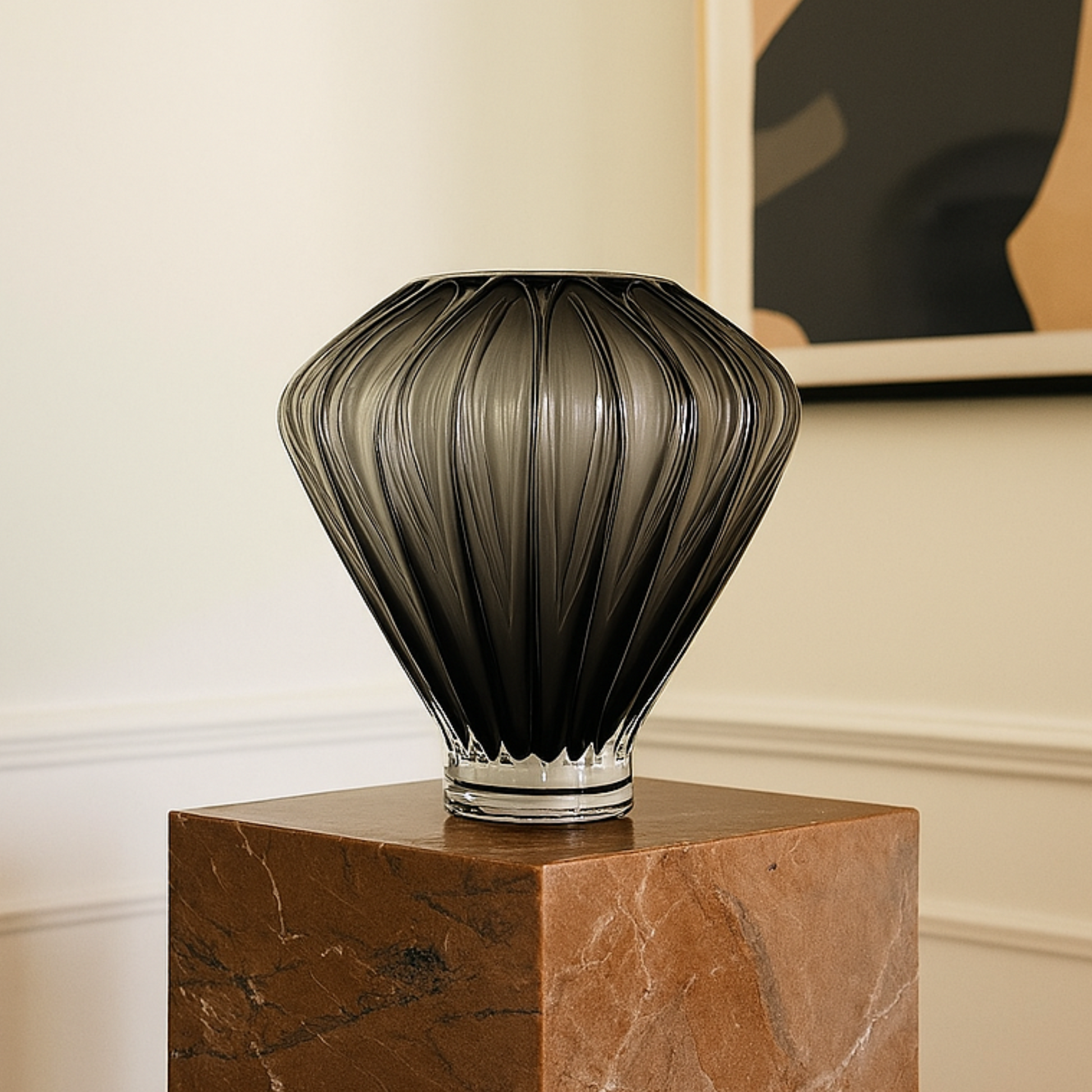 Graceful Curves, Subtle Shade - Inspired by the silhouette of a rising hot air balloon, the Cloudlift Glass Vase features soft grey glass that diffuses light like morning mist. Its rounded form and narrow neck make it ideal for single stems or as a sculptural accent.