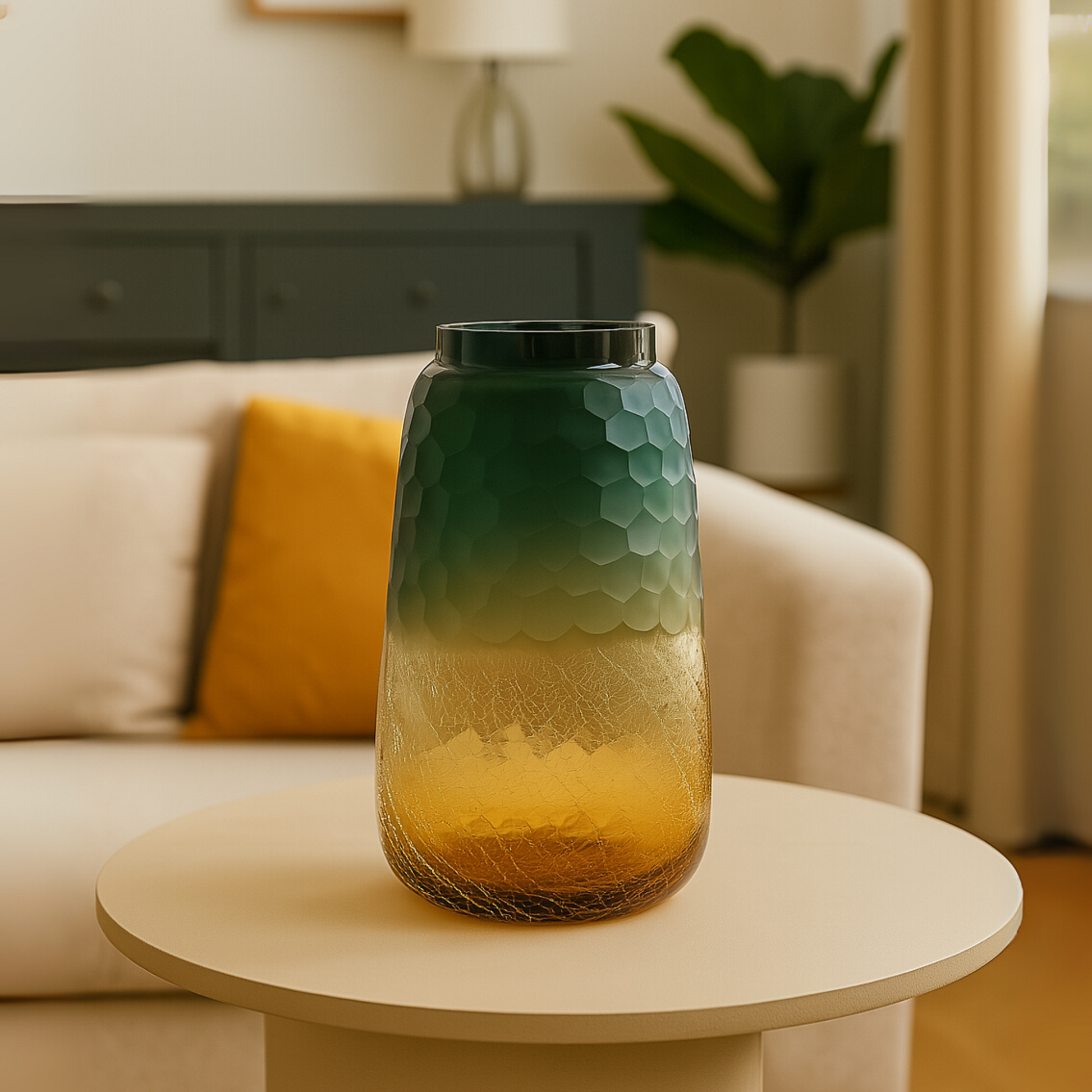 Nature’s Contrast, Artful Form - The Forest Ember Glass Vase blends deep green and warm amber tones in a graceful silhouette, capturing the spirit of woodlands at sunset. A striking piece for natural or bohemian interiors.