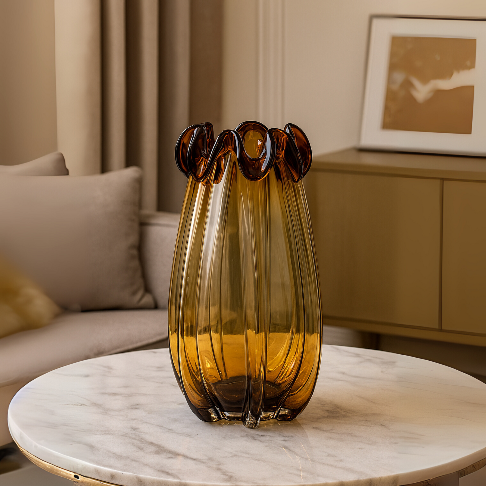 Warm Glow, Earthy Charm - With rich amber tones and a soft rounded form, the Golden Ember Glass Vase evokes cozy autumn evenings. Perfect for dried florals or rustic-chic styling.