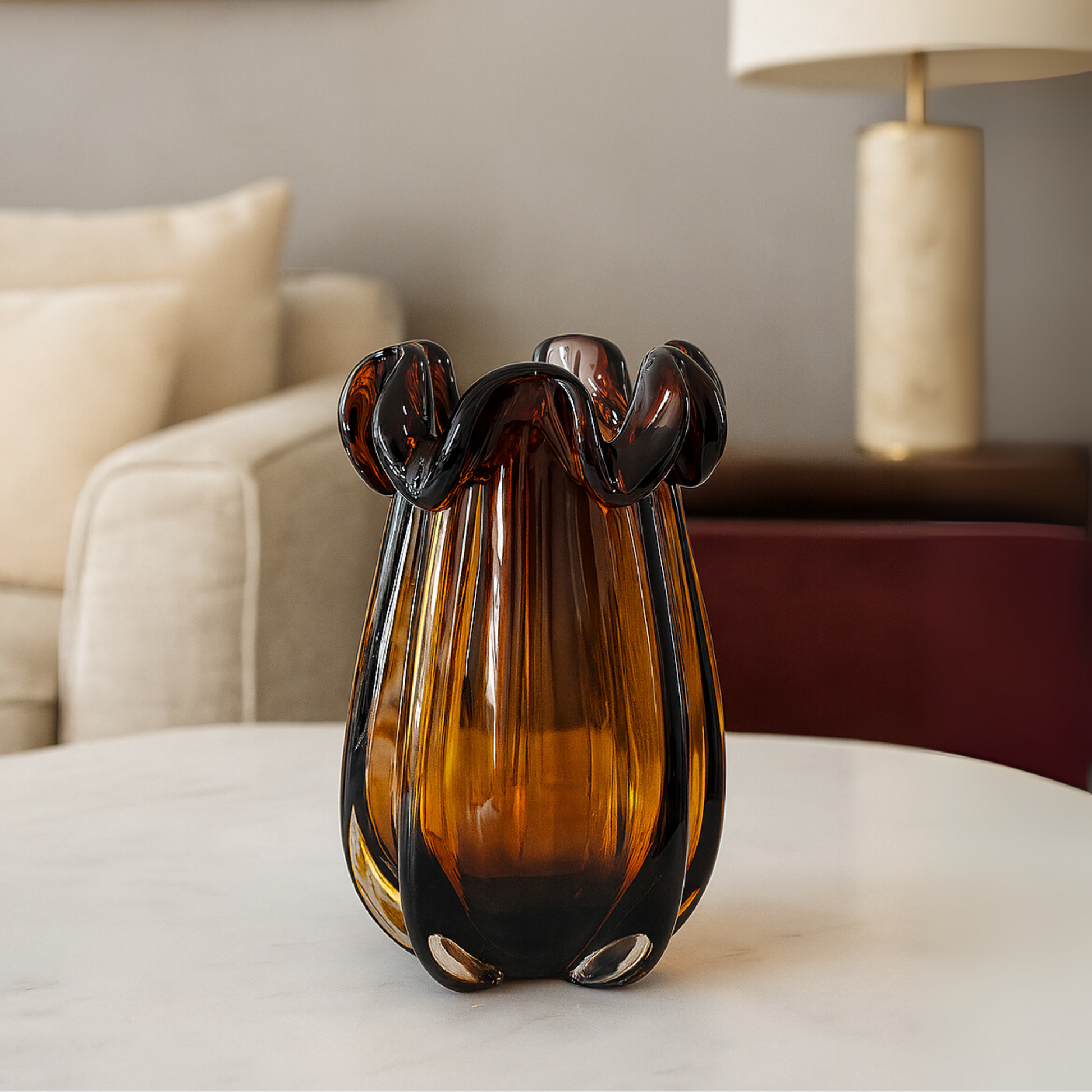 Warm Glow, Earthy Charm - With rich amber tones and a soft rounded form, the Golden Ember Glass Vase evokes cozy autumn evenings. Perfect for dried florals or rustic-chic styling.