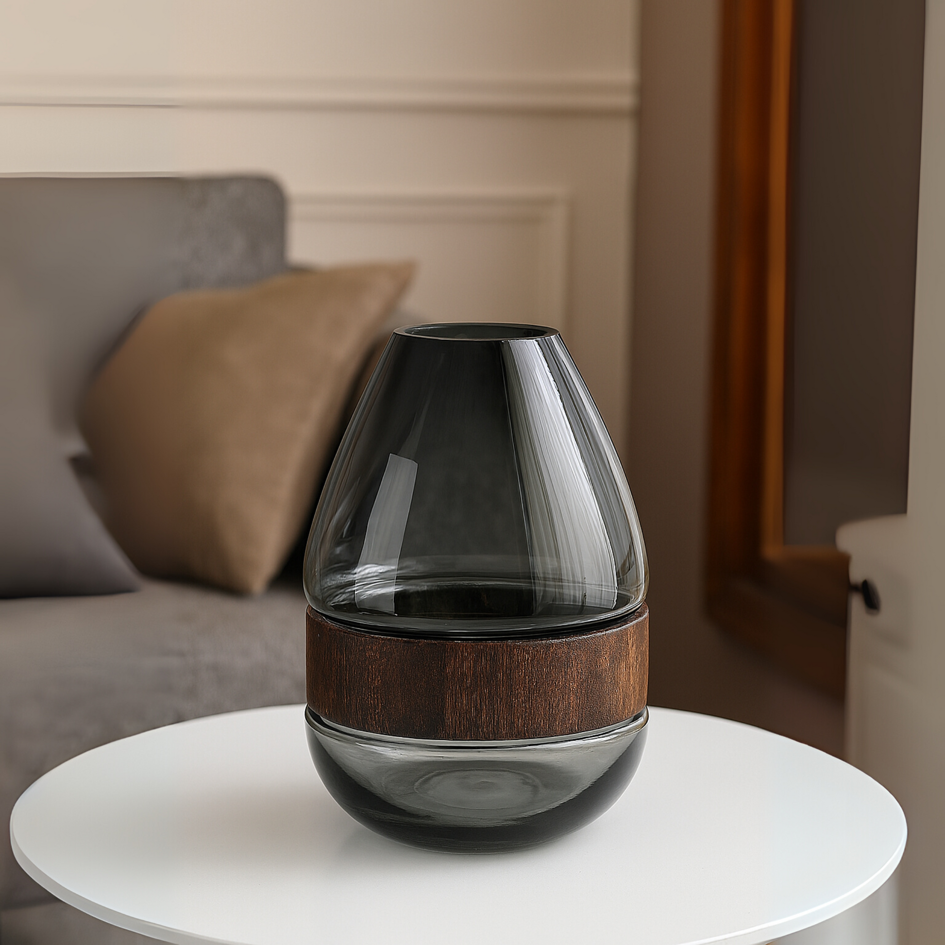Layered Texture & Tone - The GroveSmoke Glass Vase captures the essence of modern organic design. Its cool glass body is wrapped in a mid-tone wooden ring, offering visual contrast and tactile appeal.