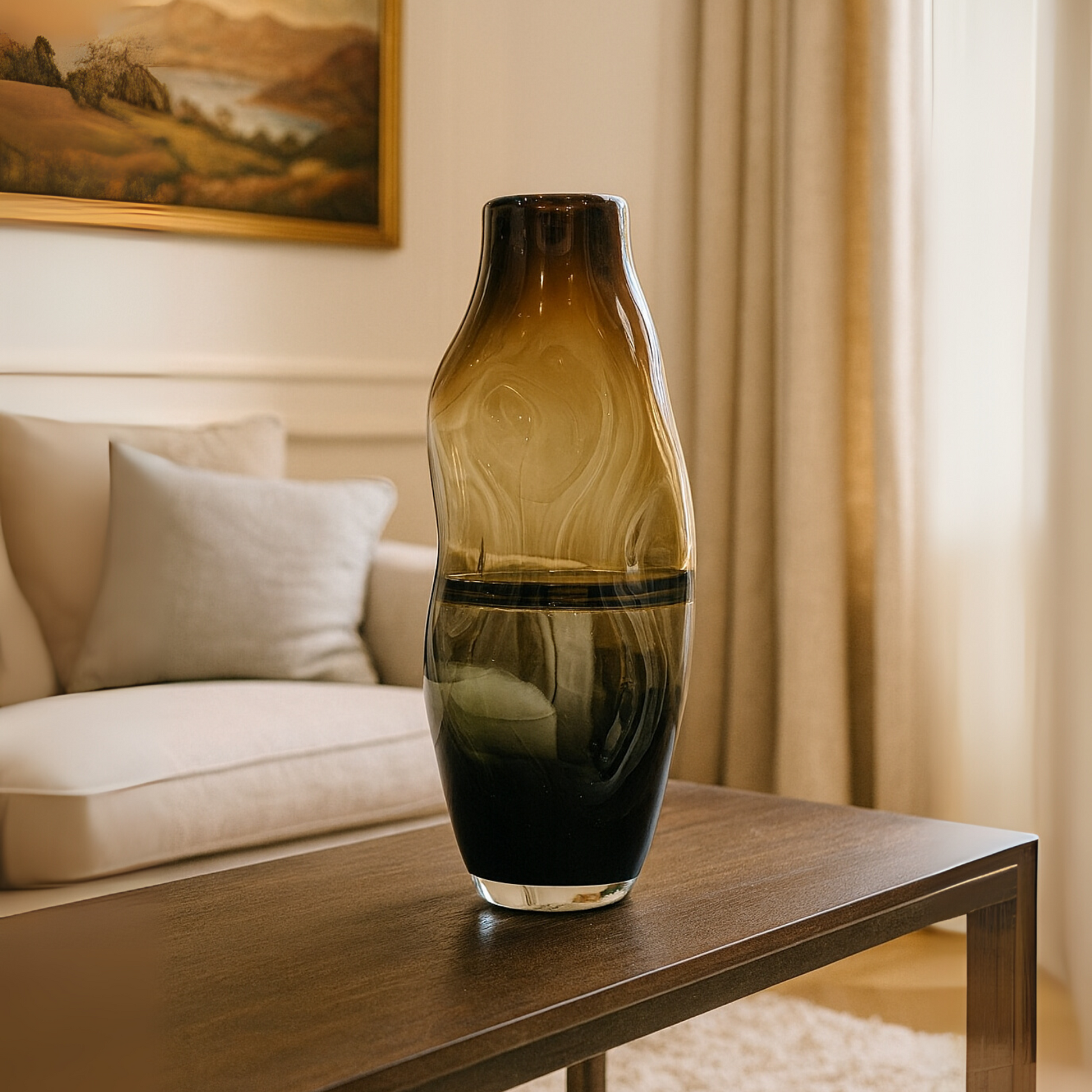 Smooth, Sophisticated Contrast - A soft coffee-brown hue fades into smoky black, giving the Mocha Smoke Glass Vase a fluid, ombré effect. Best displayed with light pampas, pale roses, or on a textured wood surface.