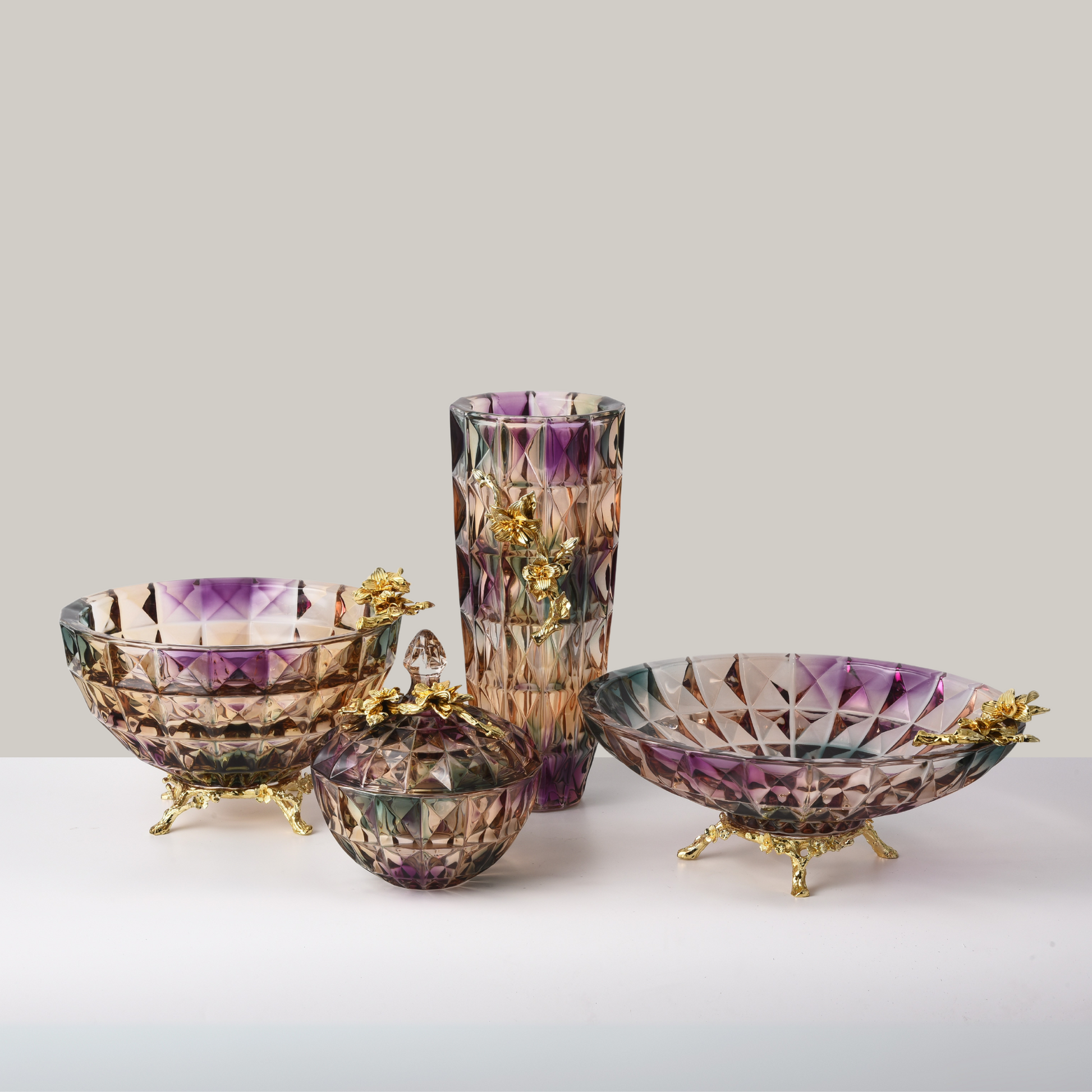 This vibrant multicolor glass fruit bowl, supported by an elegant gold zinc alloy base, exudes both energy and sophistication. Golden Harvest brings a burst of color to your space while the gilded base adds a touch of luxury, making it the perfect centerpiece for any occasion.